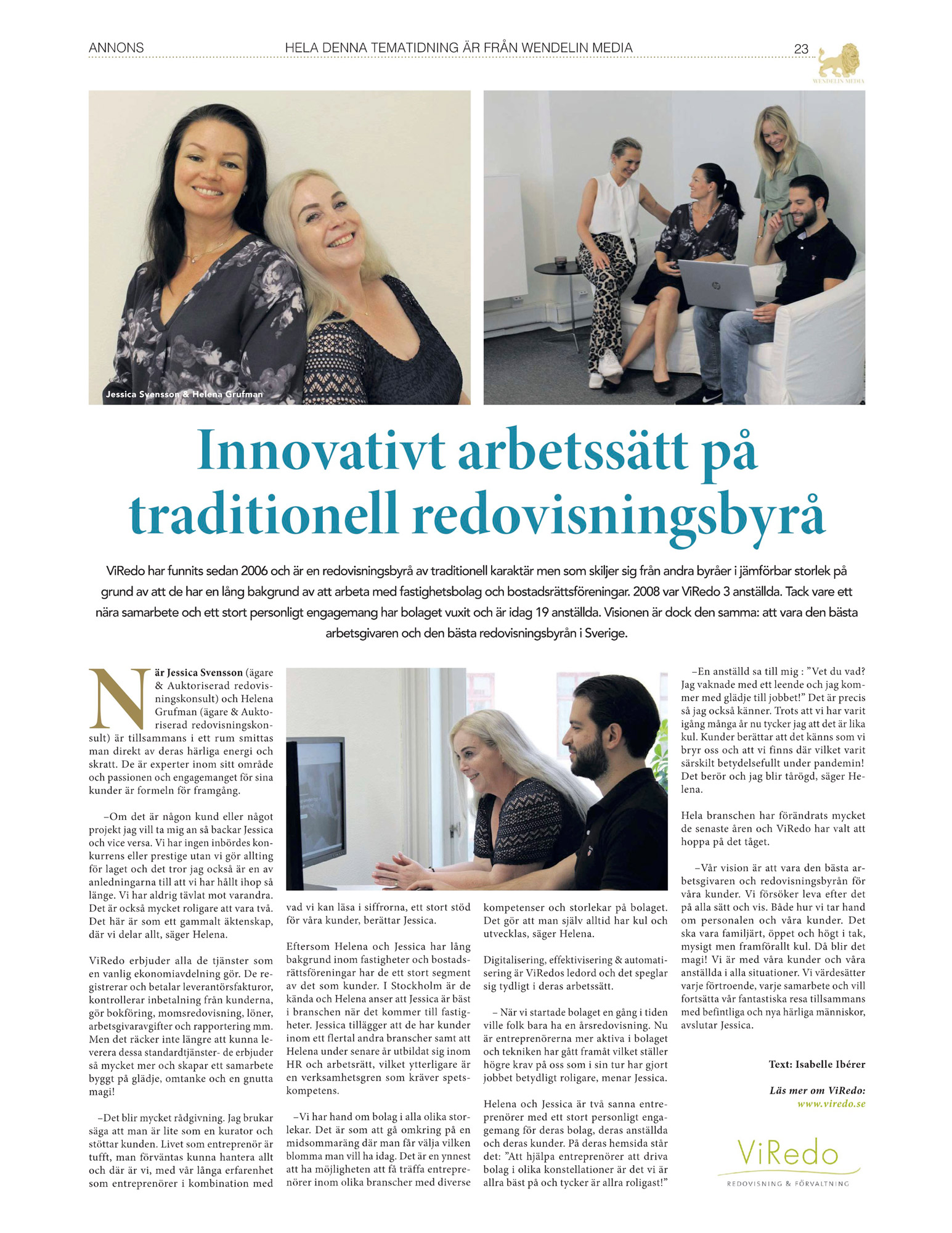 ViRedo ägs och drivs av Helena och Jessica. Vi har arbetat tillsammans sedan den 1 december 2007 och vi kan ärligt säga att vi har delat både med- och motgångar genom dessa år. Tillsammans med våra fantastiska anställda och våra fantastiska kunder har vi lyckas bygga upp ViRedo från 3 anställda till den storlek vi är idag. Vi är två sanna entreprenörer med ett stort personligt engagemang för vårt bolag, våra anställda och våra kunder. Att hjälpa entreprenörer att driva bolag i olika konstellationer är det vi är allra bäst på och tycker är allra roligast!